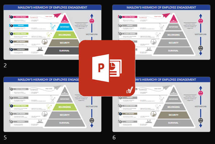 تمام عناصر قالب پاورپوینت هرم مازلو در مشارکت کارکنان کاملاْ قابل ویرایش هستند. کاربر میتواند هر مرحله از هرم را متناسب با تمِ موردنظر خود سفارشی کند. رنگها از طریق یک پالتِ رنگ تنظیم میشوند. همچنین میتوانید مجموعههای بسیار بیشتری از قالب پاورپوینت ما را بررسی کنید.